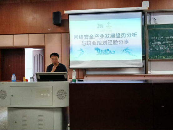 活动伊始,信息科技教研室主任张为老师向新生全面介绍了学校、学院和教研室的综合实力与发展方向,教研室汇聚了一支高学历、强实践的师资队伍,为新生们保驾护航;接着,奇安信集团资深安全工程师曹舒艺以“网络安全产业发展趋势分析与职业规划经验分享”为题,为新生描绘了信息安全行业的壮阔图景与职业路径。在全球数字化浪潮中,信息安全已成为国家战略的核心领域。据权威机构研调研,2025年全球网络安全市场规模预计突破2000亿美元,中国以30%的增速领跑全球,政府、金融、能源领域安全投入占比超60%。