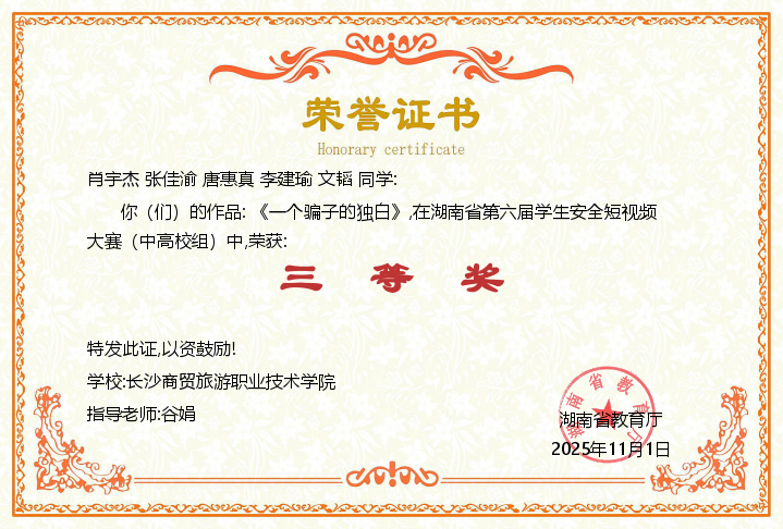 (通讯员:肖宇杰)“在视频拍摄的过程中,我更加深刻地认识到,加强大学生的安全教育十分必要。”参与拍摄的软件2433班张佳渝说到。近日,从湖南省第六届学生安全短视频大赛颁奖现场传来喜讯,我院师生创作的反诈主题短视频作品《一个骗子的独白》荣获大赛三等奖。